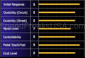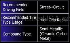 Designed for dual purpose aggressive street and light track use. Low noise and dust while offering great initial response, great pedal consistency and high levels of modulation. Targeted for light to medium weight cars and circuits with low to medium top speeds.